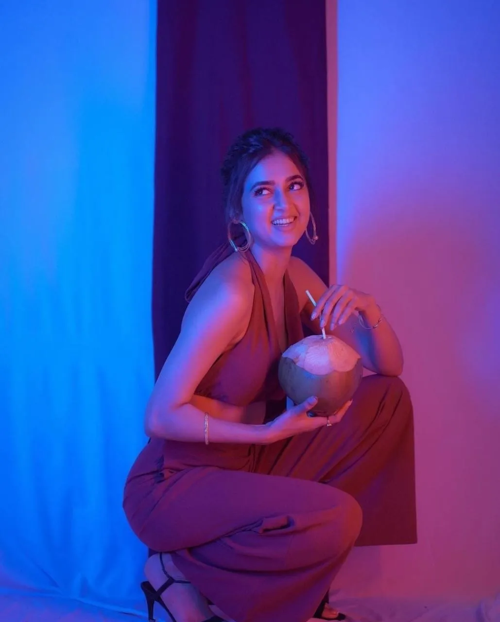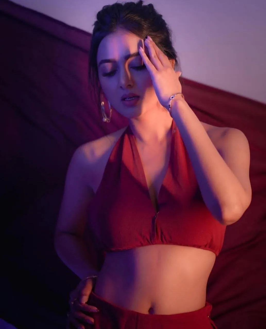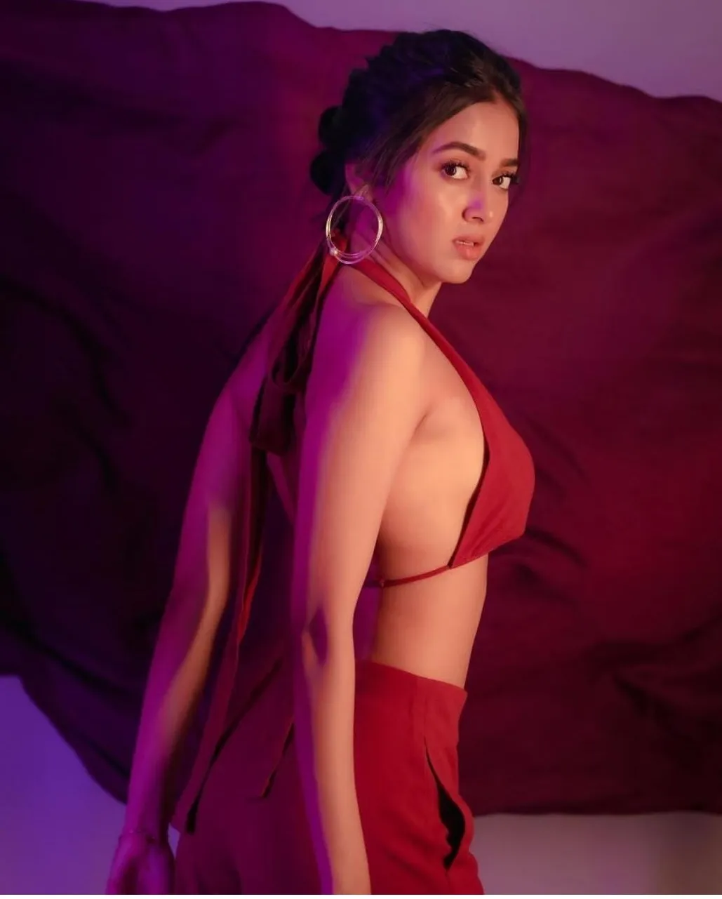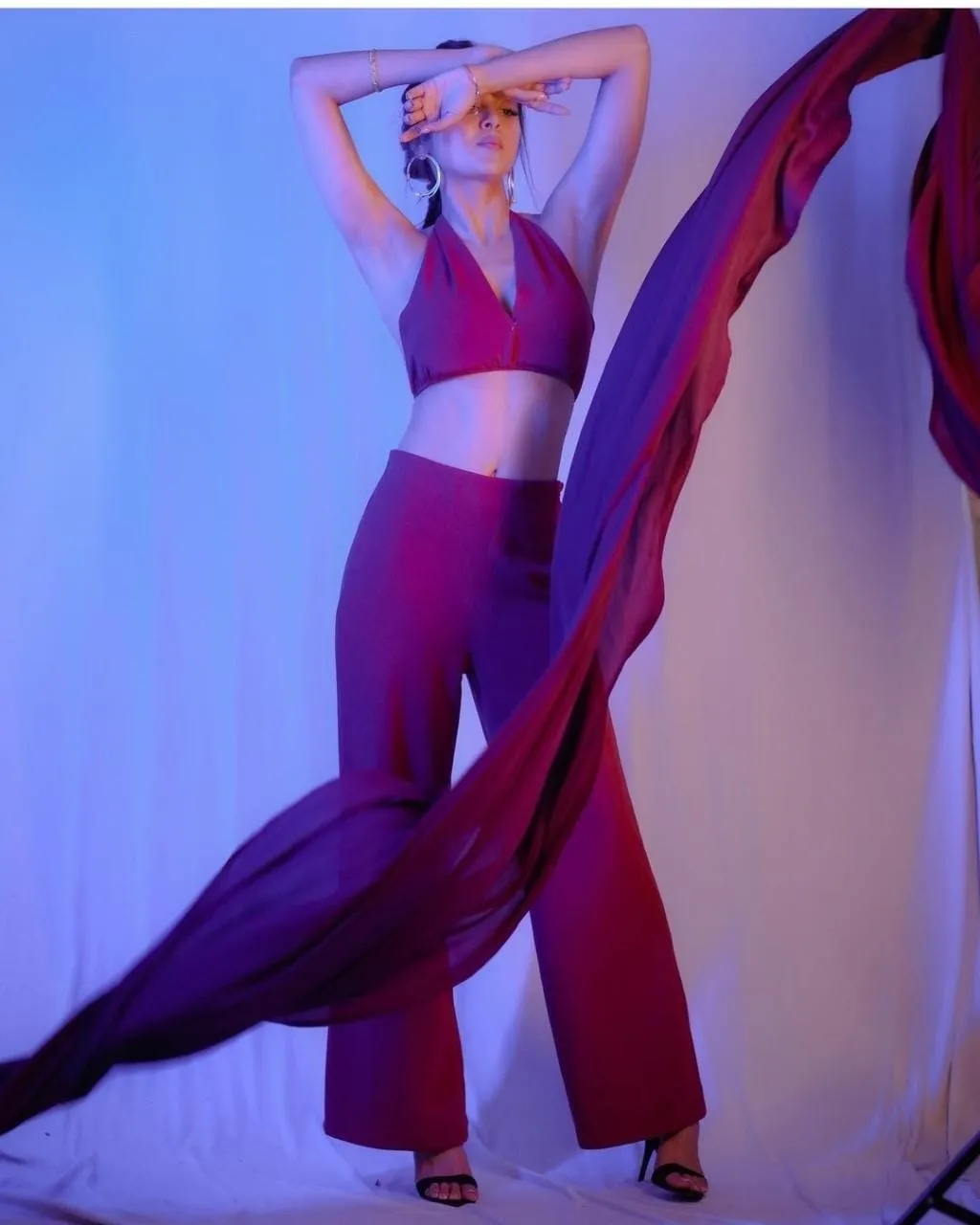 तेजस्वी प्रकाश ने मरून कलर का होरिजेंटल नेक ब्रालेट पनह रखा है और उसके साथ लूट पैंट कैरी किया है। साथ ही ड्रेस के संग दुपट्टा भी है।