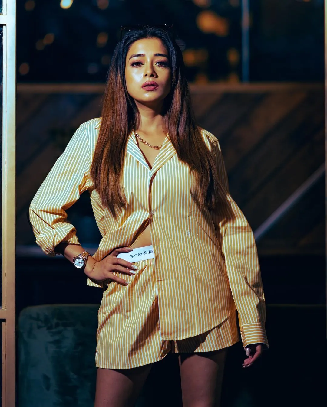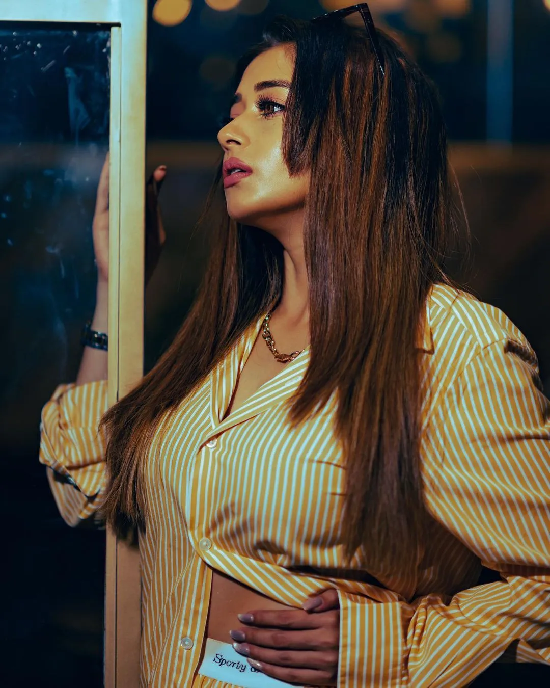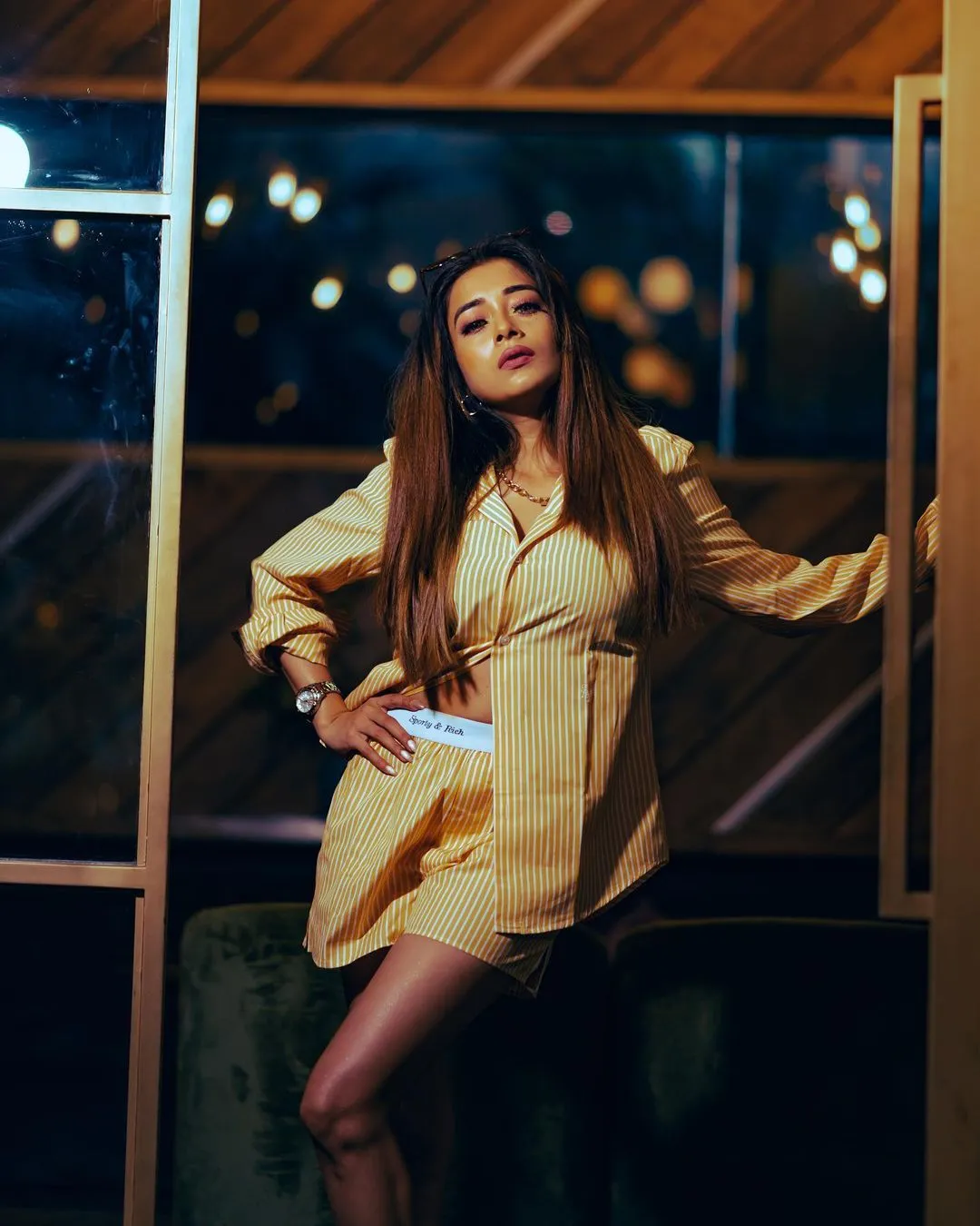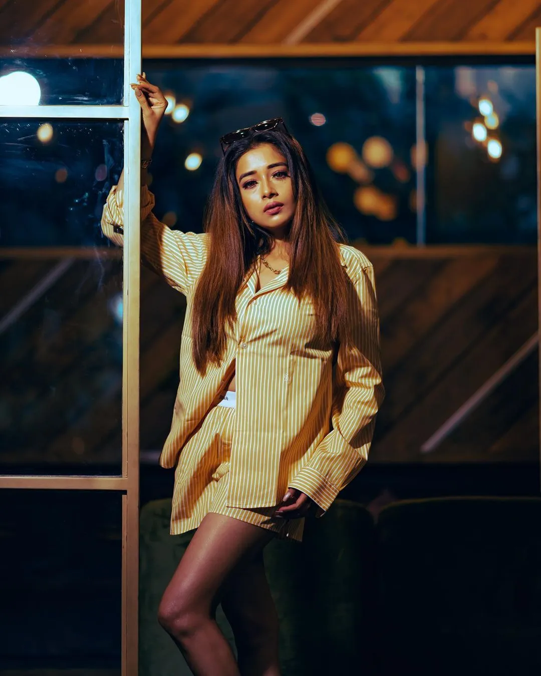 टीना दत्ता को इन तस्वीरों में पीले रंग के शॉर्ट आउफिट में देखा जा सकता है। उन्होंने व्हाइट स्ट्रिप्स वाली पीली ओवरसाइज्ड शर्ट पहने हुए हैं।