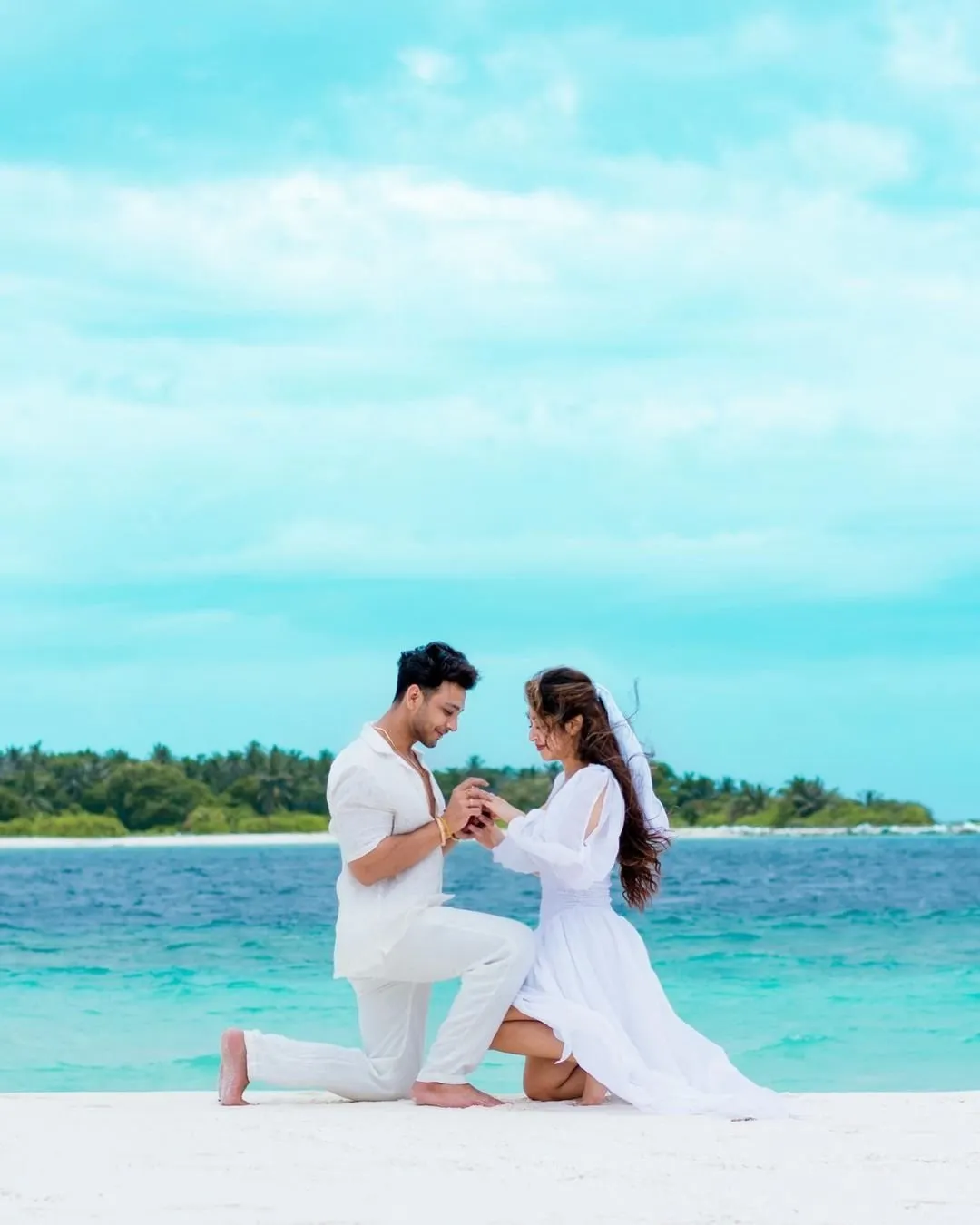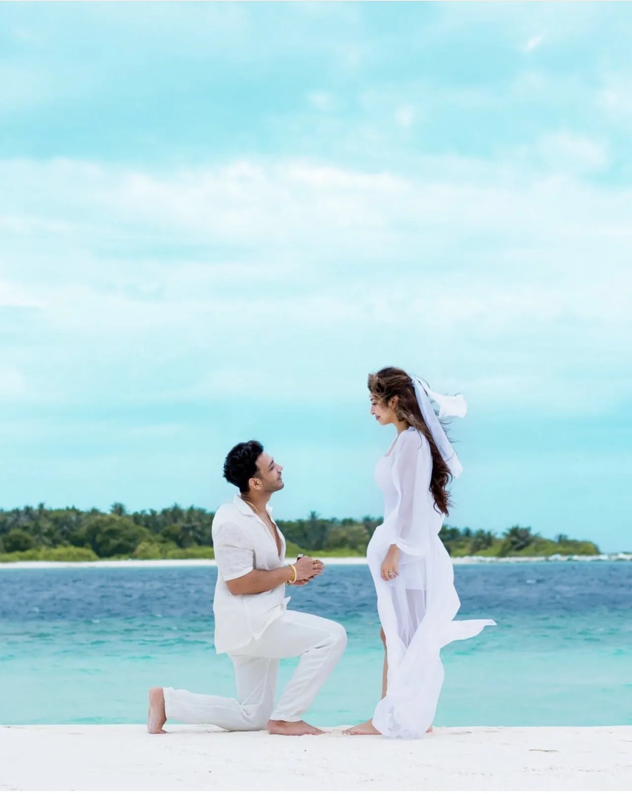 इन तस्वीरों में देखा जा सकता है कि सोनारिका और उनके मंगेतर विकास पराशर समुद्र के किनारे ऑल व्हाइट ड्रेस में सगाई कर रहे हैं। पहली तस्वीर में देखा जा सकता है कि रोमांटिक अंदाज में अपने घुटनों पर बैठकर विकास सोनारिका को अंगूठी पहना रहे हैं।