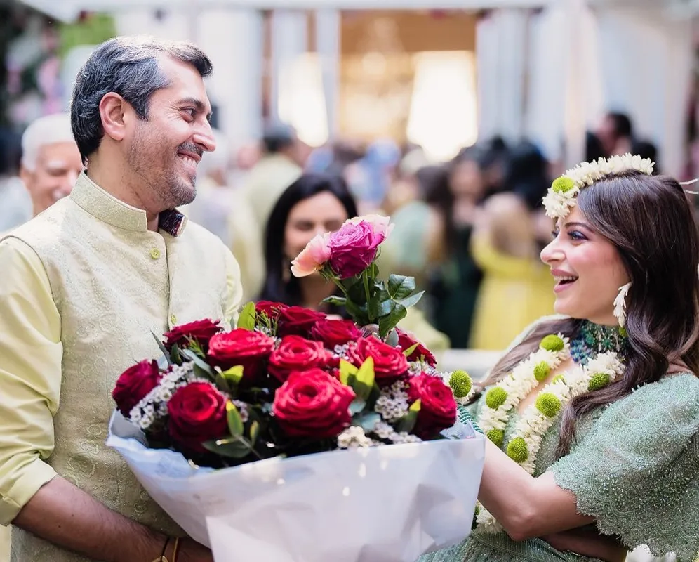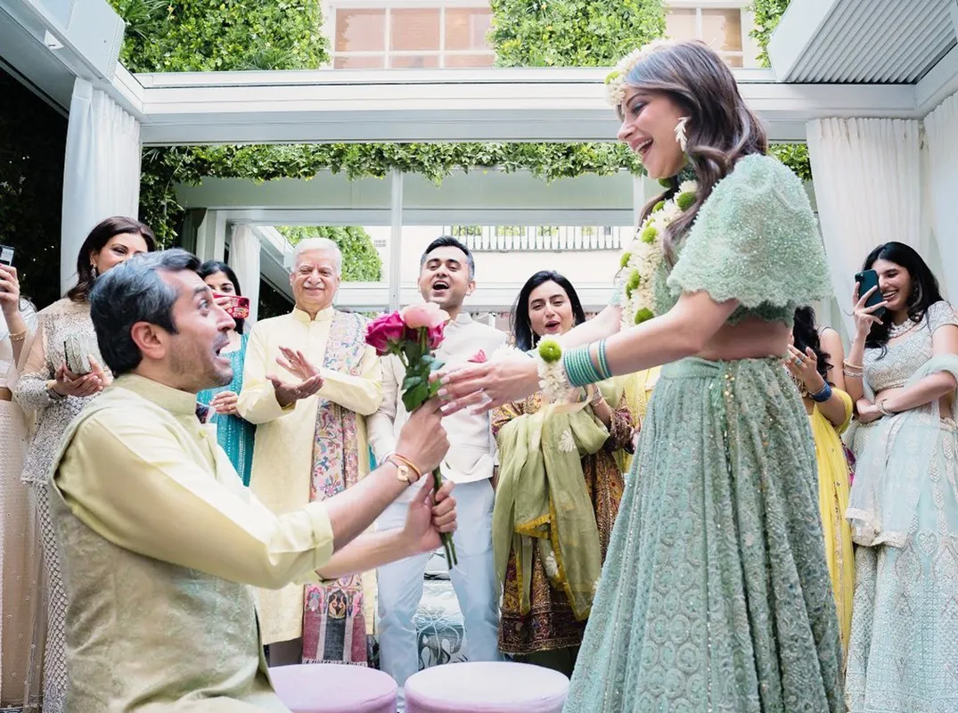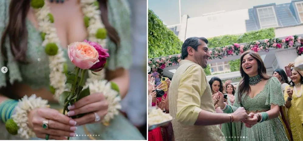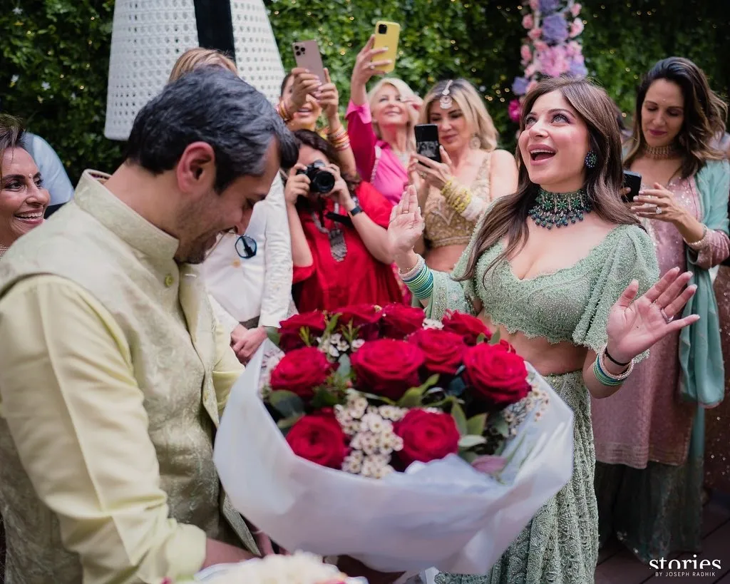 कनिका ने अपनी मेहंदी के दिन थीम से मैच करते हुए लाइट ग्रीन कलर का लहंगा पहना है। इस लहंगे में कनिका कपूर बेहद खूबसूरत लग रही हैं। उनके मंगेतर ने क्रीम कलर का कुर्ता पायजामा, बास्केट पहनी है।