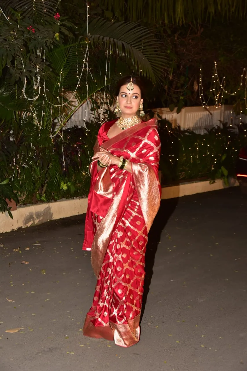 फिल्म इंडस्ट्री की डीवा दीया मिर्जा ने अपनी दूसरी शादी 15 फरवरी 2021 को मुंबई के बिजनेसमैन वैभव रेखी के साथ की थी। अपनी शादी में उन्होंने लाल बनारसी साड़ी पहनी थी। ब्राइडल लुक लाल जोड़े में वो किसी अफ्सरा जैसी नजर आ रही थी। दीया ने अपने गॉर्जियस लुक से सभी का दिल जीत लिया था। उनकी इस वेडिंग आउटफिट को संजय गर्ग ने डिजाइन किया था।