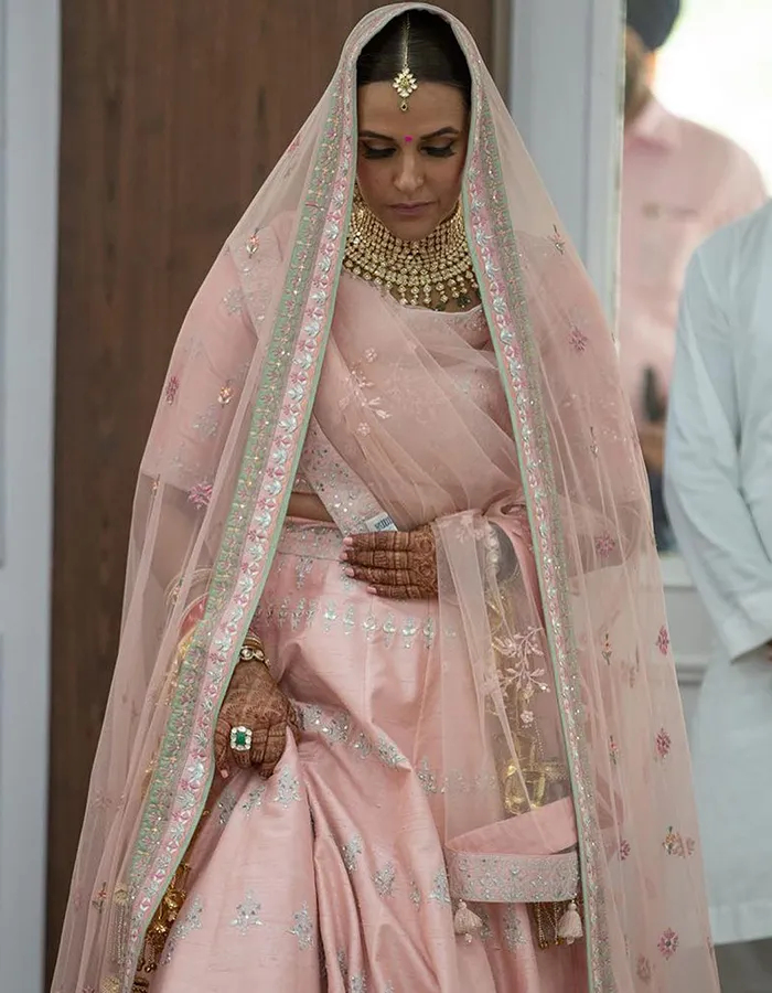 बॉलीवुड एक्ट्रेस नेहा धूपिया ने सोनम कपूर की शादी के 2 दिन बाद ही अपने बेस्टफ्रेंड अंगद बेदी के साथ पंजाबी शादी कर 4 फेरे लिये थे। इस शादी में एक्ट्रेस ने पिंक रंग का अट्रैक्टिव और प्यारा सा लहंगा पहना। नेहा का ये खूबसूरत लहंगा डिजाइनर अनिता डोंगरे ने डिजाइन किया था। इसकी कीमत लगभग 2 लाख था।