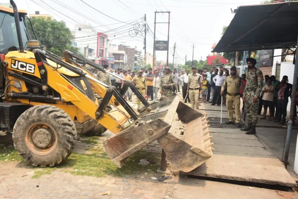 मुरादाबाद: अतिक्रमण के खिलाफ गरजी पालिका की जेसीबी, दुकानों के छज्जे ढहाए