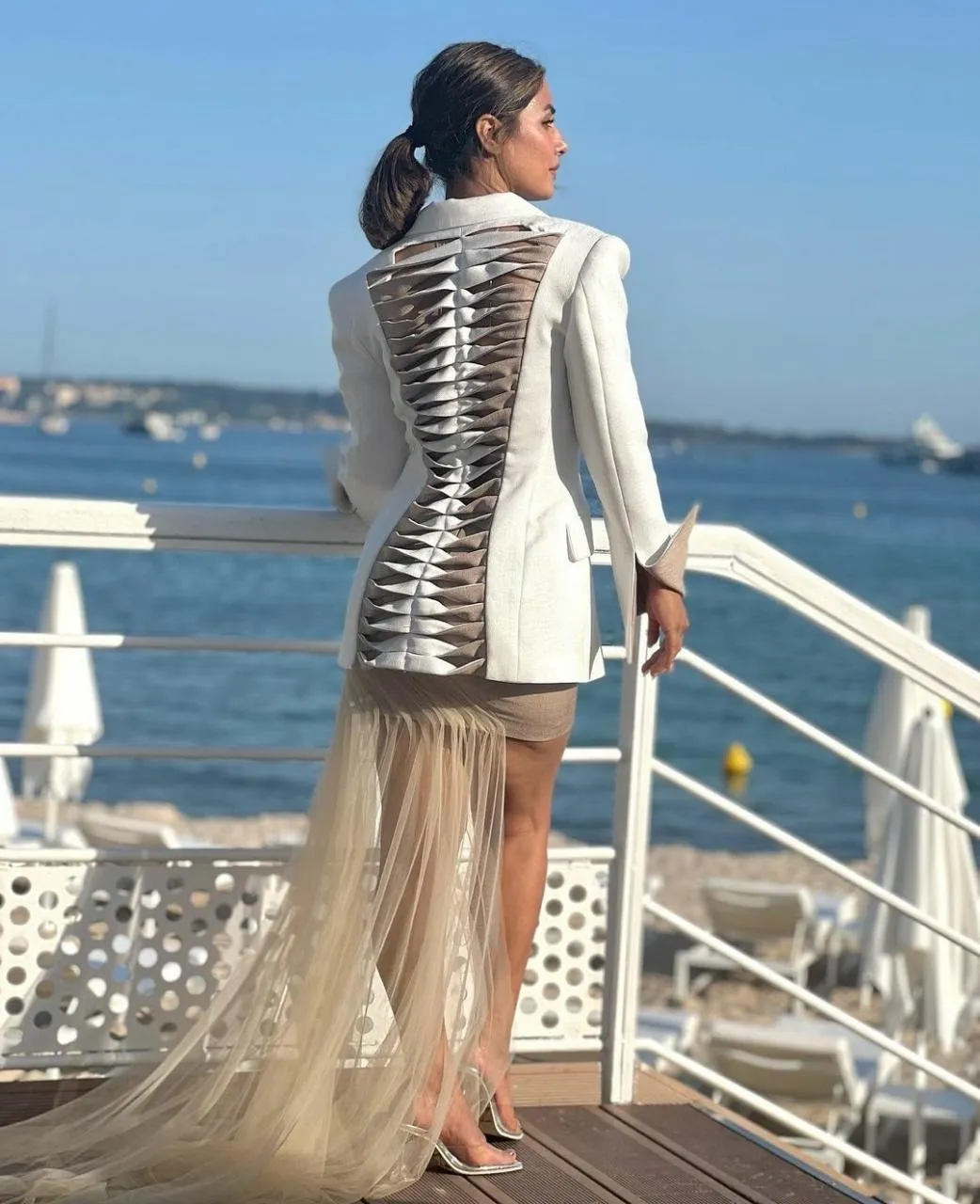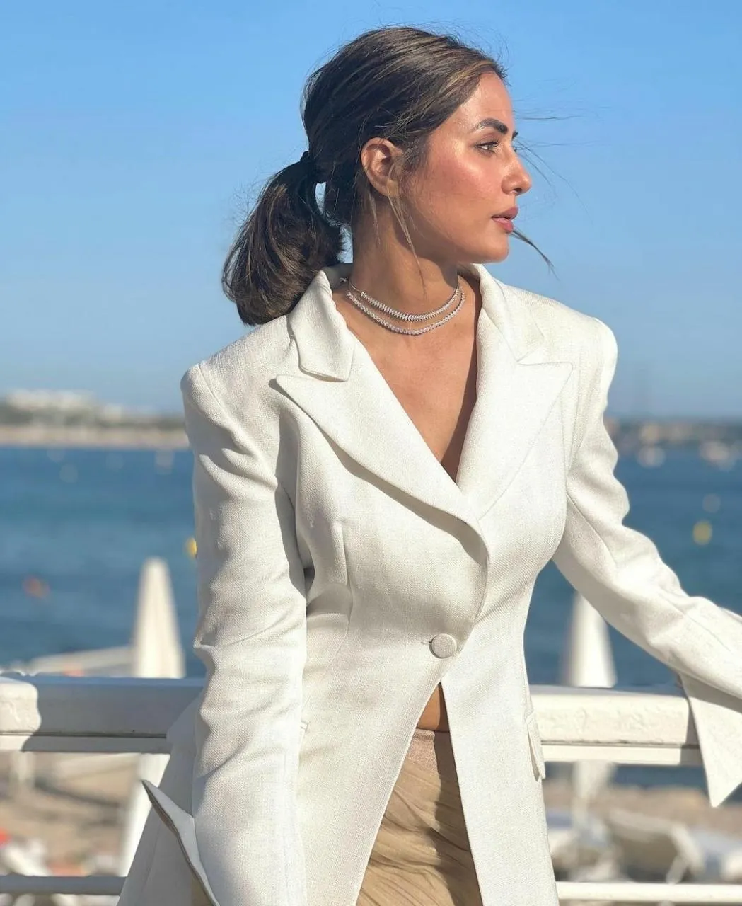हिना खान ने अपने ग्लैमरस अंदाज को फ्लॉन्ट करते हुए व्हाइट स्टाइलिश ब्लेजर, लाइट बेज कलर की शॉर्ट स्कर्ट पहनी है। उनकी स्कर्ट के साथ नेट की लॉन्ग ट्रेन अटैच है।