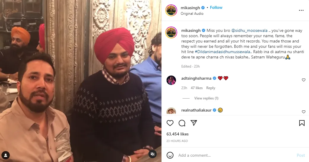 वहीं वीडियो शेयर करते हुए मीका ने लिखा कि सिद्धू मूसेवाला आपको मिस करेंगे।आप बहुत जल्दी चले गए। लोग आपको हमेशा आपके नाम से याद करेंगे, आपकी इज्जत करेंगे जो आपने हिट रिकॉर्ड्स के जरिए कमाई है। मैं और आपके फैंस आपकी हिट लाइन #Dildanimadasidhumussewala को मिस करेंगे। सतनाम वाहेगुरू।