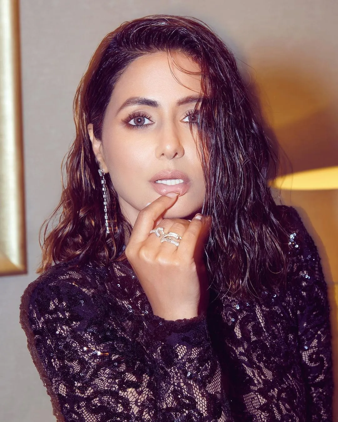 हिना ने अपने इस लुक को कंप्लीट करने के लिए न्यूड मेकअप और स्मोकी आई लुक रखा है।