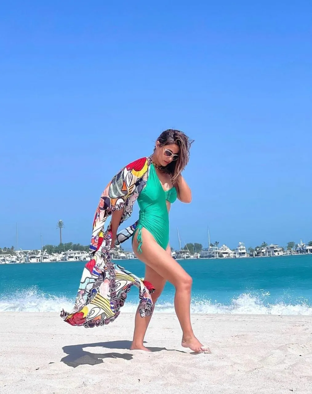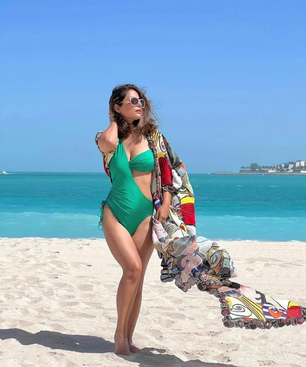 Hina Khan Photos : ग्रीन मोनोकनी में हिना खान का हॉट लुक, समुद्र किनारे दिए सिजलिंग पोज