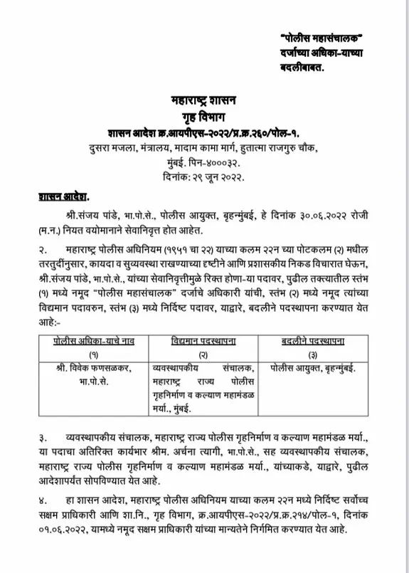 मुंबई। उद्धव ठाकरे (Uddhav Thackeray) ने महाराष्ट्र के मुख्यमंत्री पद (Maharashtra Chief Minister) से इस्तीफा (Resign) दे दिया है। लेकिन, इस्तीफा देने से उन्होंने पहले कई बड़े फैसले किए। उन्होंने अपने पद से इस्तीफे से पहले वरिष्ठ आईपीएस अधिकारी (Senior IPS Officer) विवेक फानसलकर (Vivek Phansalkar) को मुंबई का नया पुलिस कमिश्नर (Mumbai Police Commissioner) बनाया है।