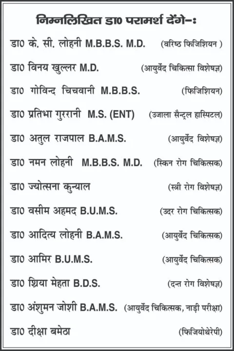 चिकित्सा शिविर संयोजक विशाल सिंघल ने बताया कि शिविर में डॉ. केसी लोहनी, डॉ. प्रतिभा गुरुरानी, डॉ. गोविंद चिचवानी, डॉ. विनय खुल्लर, डॉ. ज्योत्सना कुन्याल, डॉ. नमन लोहनी, डॉ. आमिर, डॉ. वसीम अहमद, डॉ. श्रिया मेहता, डॉ. दीक्षा बमेटा, डॉ. अतुल राजपाल, डॉ. आदित्य लोहनी, डॉ. अंशुमन जोशी एलोपैथी एवं आयुर्वेद चिकित्सा पद्यति से परामर्श देंगे। साथ ही निःशुल्क शुगर, ब्लड प्रेशर एवं उपलब्धता अनुसार औषधियों का वितरण किया जाएगा। डॉ. खुल्लर ने अपील की है कि निःशुल्क चिकित्सा शिविर में अधिक से अधिक लोग पहुंच कर लाभ उठाएं।