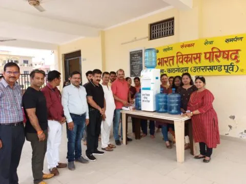 लोकमणि दुम्का सेवादीप निकेतन पुस्तकालय में वाटर कूलर भेंट करते भारत विकास परिषद शाखा काठगोदाम के पदाधिकारी।