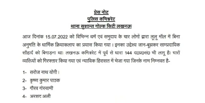 देर शाम लखनऊ पुलिस कमिश्नरेट ने इस सम्बन्ध में एक प्रेस रिसीज जारी करते हुए जानकारी दी है। प्रेस रिसीज के आधार पुलिस ने बताया कि विभिन्न धर्म एवं समुदाए के चारों लोगों ने लूलू मॉल में बिना अनुमति के धार्मिक क्रियाकलाप करने का प्रयास किया है।