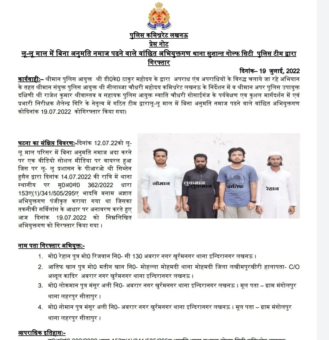 लखनऊ। उत्तर प्रदेश पुलिस ने लुलु मॉल (लखनऊ) में नमाज़ पढ़ने वाले लोगों के हिंदू होने के दावों को ‘भ्रामक’ बताया है। बकौल पुलिस, मॉल में हनुमान चालीसा पढ़ने की कोशिश पर तीन हिंदू युवकों व नमाज़ पढ़ने के प्रयास पर अरशद अली की गिरफ्तारी हुई थी लेकिन नमाज़ पढ़ने के मामले में अभी कोई आरोपी चिह्नित नहीं हो सका है।