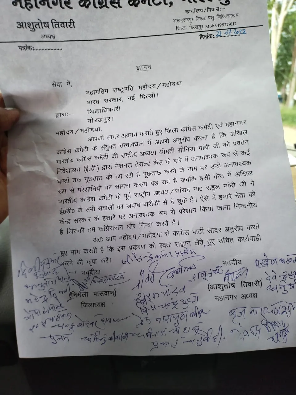 गोरखपुर। नेशनल हेराल्ड केस में (ईडी) प्रवर्तन निदेशालय द्वारा की जा रही जांच के सिलसिले में श्रीमती सोनिया गांधी को बार बार बुलाने के विरोध में कांग्रेस शीर्ष नेतृत्व के निर्देश पर आज कांग्रेस के जिला अध्यक्ष निर्मला पासवान एवं शहर अध्यक्ष आशुतोष तिवारी के तत्वाधान में कांग्रेसियों ने गोलघर गांधी प्रतिमा से पैदल मार्च करते हुए कलेक्ट्रेट पहुंचकर राष्ट्रपति को संबोधित ज्ञापन उप जिलाधिकारी सदर को सौंपा ।