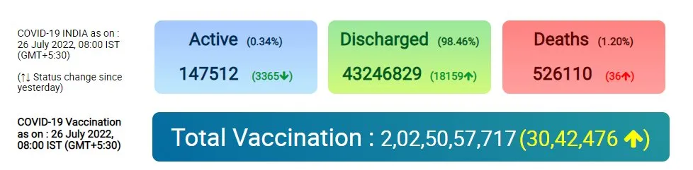 मंत्रालय के अनुसार, राष्ट्रव्यापी टीकाकरण अभियान के तहत देश में अब तक कोविड-19 रोधी टीकों की 202.5 करोड़ से अधिक खुराक लगाई जा चुकी हैं। गौरतलब है कि देश में सात अगस्त 2020 को संक्रमितों की संख्या 20 लाख, 23 अगस्त 2020 को 30 लाख और पांच सितंबर 2020 को 40 लाख से अधिक हो गई थी। संक्रमण के कुल मामले 16 सितंबर 2020 को 50 लाख, 28 सितंबर 2020 को 60 लाख, 11 अक्टूबर 2020 को 70 लाख, 29 अक्टूबर 2020 को 80 लाख और 20 नवंबर को 90 लाख के पार चले गए थे।