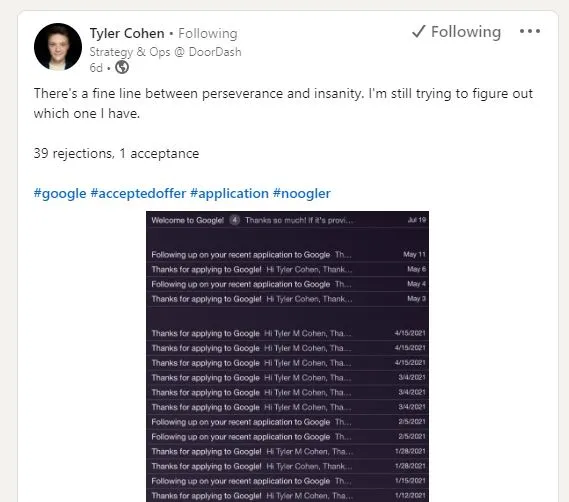टायलर कोहेन ने Tech Giant के लिए एक या दो बार नहीं, बल्कि 39 बार आवेदन किया और अंतिम 19 जुलाई को जब उन्हें नौकरी मिली तो उन्होंने अपने सभी ईमेल संचार का स्क्रीनशॉट Google के साथ साझा किया है। कोहेन सैन फ़्रांसिस्को (San Francisco) में रहते हैं और Google द्वारा किसी पद का ऑफर दिए जाने से पहले उन्होंने DoorDash में एसोसिएट मैनेजर – रणनीति और संचालन के रूप में काम किया था।
