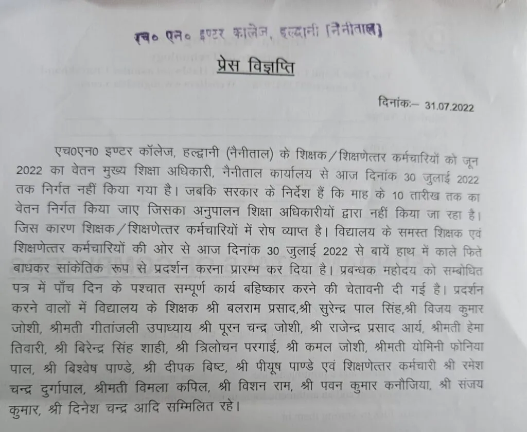 हल्द्वानी: वेतन न मिलने से नाराज एचएन इंटर कॉलेज के शिक्षक-कर्मचारियों का प्रदर्शन, कार्य बहिष्कार की चेतावनी दी