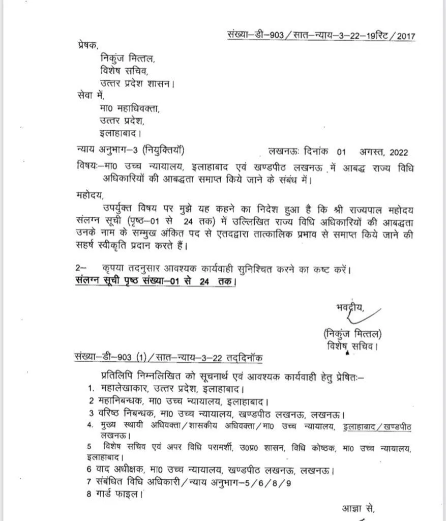 शासन के विशेष सचिव निकुंज मित्तल की ओर से जारी 1 अगस्त 2022 के आदेश में स्पष्टतौर पर उच्च न्यायालय खण्डपीठ लखनऊ में पूर्व से आबद्ध मुख्य स्थायी अधिवक्तागण को पुनक्रर्मांकित किया गया है।