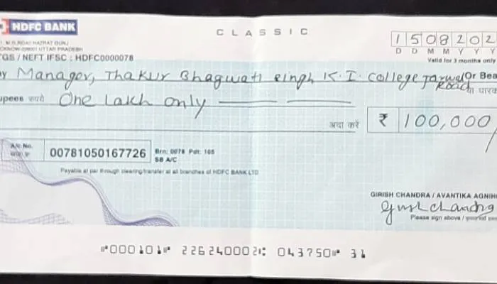बहराइच। ठाकुर भगौती सिंह इंटर कालेज के पूर्व छात्र ने पिता की इच्छा अनुसार विद्यालय के जीर्णोधार के लिए एक लाख रुपए का चेक दिया है। इसको लेकर विद्यालय परिवार के साथ छात्र भी खुश हैं। जरवल रोड में स्थित ठाकुर भगौती सिह किसान इण्टर कालेज के पूर्व छात्र एवं सीनियर कंसेल्टेंट टाटा कंसल्टेंसी लखनऊ में सेवारत गिरीश चंद अग्निहोत्री ने अपने स्वर्गीय पिता के इच्छा स्वरूप विद्यालय के जीर्णोद्वार के लिए विद्यालय प्रबंध तंत्र को एक लाख रूपये की सहायता चेक प्रदान किया है।