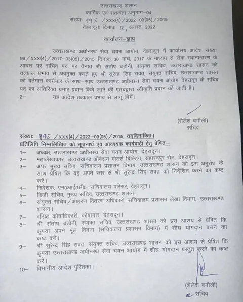 हल्द्वानी, अमृत विचार। शासन ने उत्तराखंड राज्य अधीनस्थ सेवा चयन आयोग के सचिव संतोष बड़ोनी को तत्काल प्रभाव से हटा दिया है। उनके स्थान पर संयुक्त सचिव सुरेंद्र रावत को उत्तराखंड अधीनस्थ सेवा चयन आयोग के सचिव का प्रभार दिया गया है। सचिव शैलेश बगौली की ओर से इस बावत आदेश जारी किए गए हैं। …