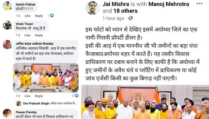 फोटो में संतों के साथ नगर विधायक वेद गुप्त व प्रॉपर्टी डीलर अभिषेक अग्रवाल की तस्वीर वायरल होते ही सपा के पूर्व मंत्री तेज नारायण पांडे ने लिखा कि प्रॉपर्टी डीलर भी साथ है। विकास प्राधिकरण पर दबाव बनाने की कोशिश है। अनिल यादव ने लिखा कि इसकी आड़ में एक माननीय भी जमीनों का फैजाबाद और अयोध्या में धंधा करते है।