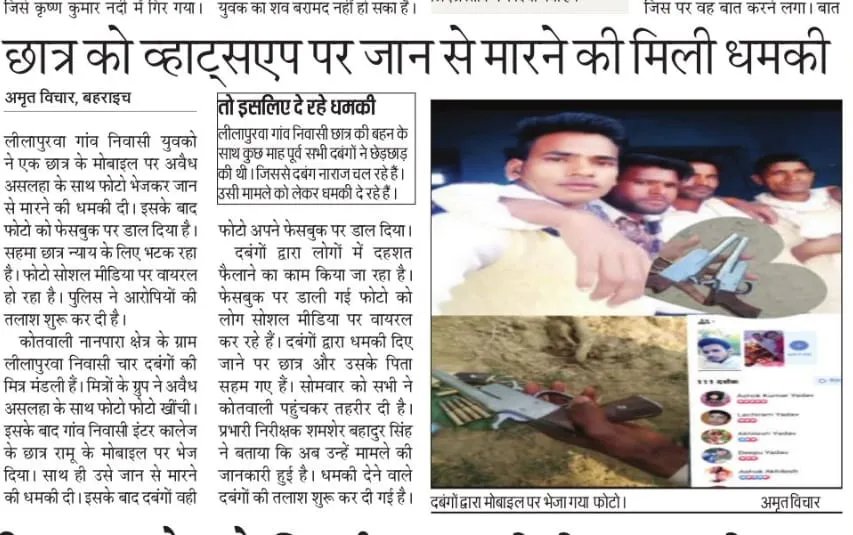 बहराइच। जिले के लीलापुरवा गांव निवासी युवको ने एक छात्र के मोबाइल पर अवैध असलहा के साथ फोटो भेजकर जान से मारने की धमकी दी थी। इस खबर का प्रकाशन अमृत विचार अखबार ने मंगलवार के अंक में प्रमुखता से प्रकाशित किया था। खबर का संज्ञान लेते हुए पुलिस ने पांच लोगों के विरुद्ध मुकदमा दर्ज कर जांच शुरू कर दी है।