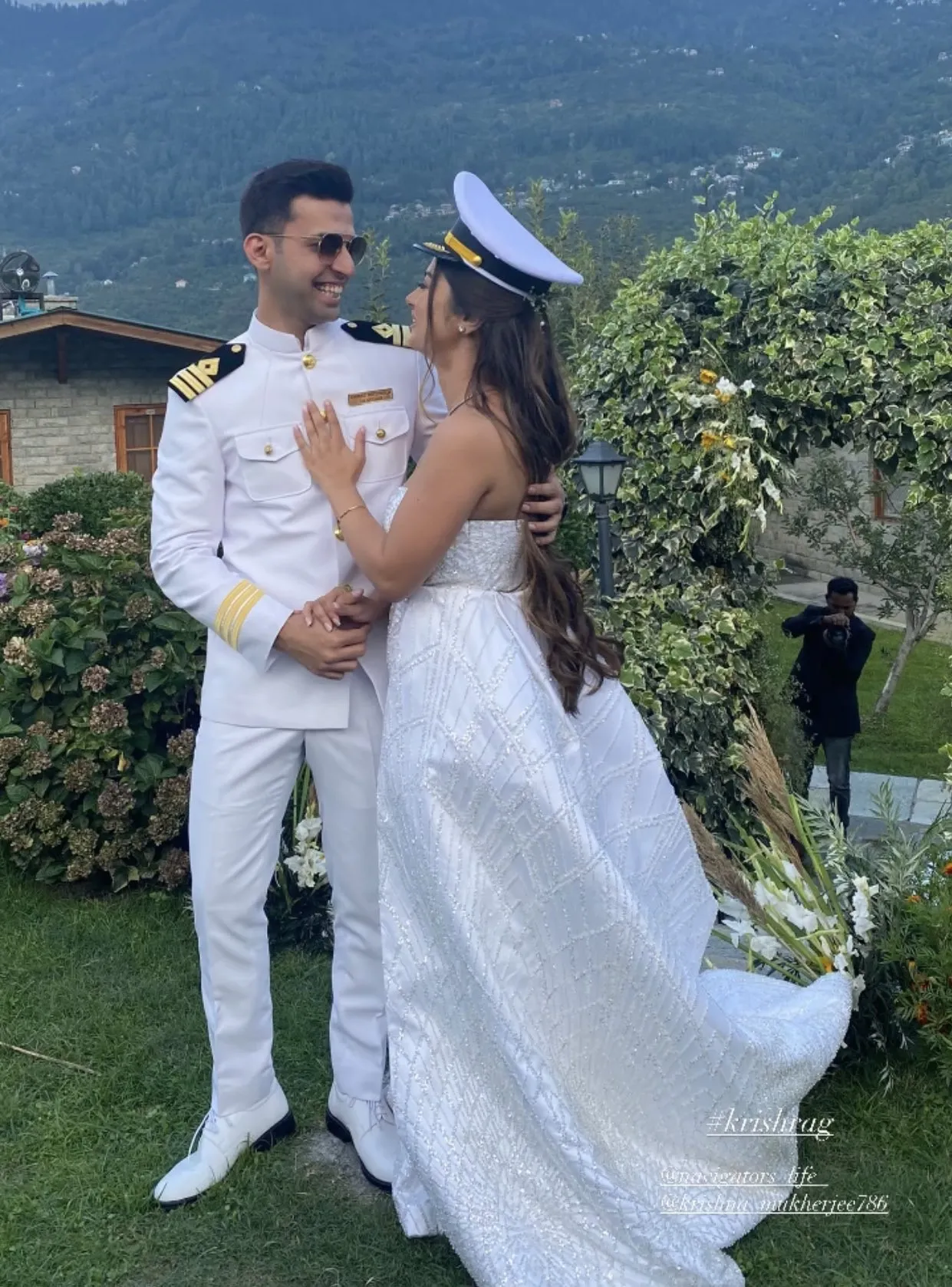 अपनी सगाई के मौके पर कृष्णा मुखर्जी ने व्हाइट कलर का गाउन पहना है, जिसमें वह किसी परी से कम नहीं लग रही। वहीं, उनके मंगेतर ने मर्चेंट नेवी की ड्रेस पहनी। कृष्णा मुखर्जी और चिराग अपनी सगाई की तस्वीरों में एक-दूसरे के प्यार में पूरी तरह खोए हुए नजर आए।
