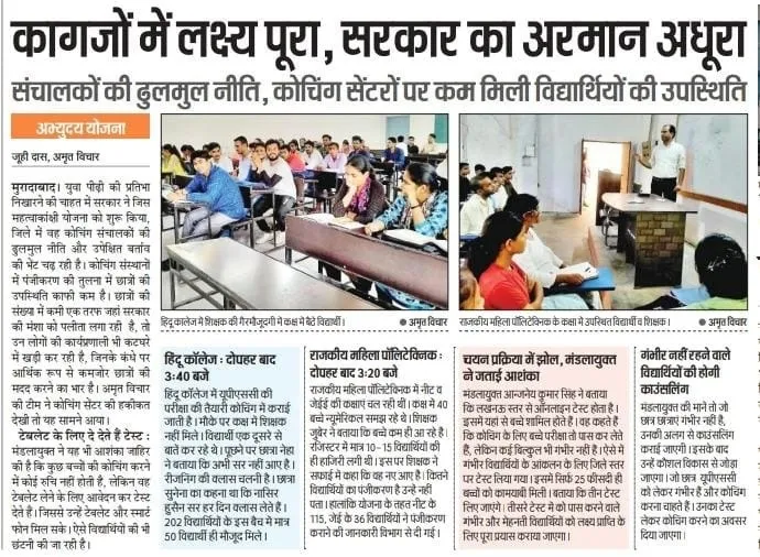 योजना के मूर्तरूप लेते ही कोचिंग सेंटर मेरठ की तर्ज पर काम करने लगेगें। केंद्र सरकार की महत्वाकांक्षी अभ्युदय योजना के तहत जिले में दो सेंटर संचालित हैं। इसमें एक राजकीय महिला पॉलिटेक्निक और दूसरा हिंदू कॉलेज में। अमृत विचार की टीम ने 12 सितंबर को कोचिंग सेंटरों में संसाधनों का जायजा लिया तो तस्वीर सामने आई। राजकीय महिला पॉलिटेक्निक में न तो पर्याप्त रोशनी की व्यवस्था थी और न ही साफ-सफाई। मौके पर विद्यार्थियों की संख्या की कम पाई गई। कोचिंग सेंटर की लचर व्यवस्था को अमृत विचार समाचार पत्र ने इसे प्रमुखता से प्रकाशित किया था। जिसका संज्ञान लेकर मंडलायुक्त ने व्यवस्था में सुधार लाने के निर्शदे दिए। अब राजकीय महिला पॉलिटेक्निक की जगह हिन्दू कॉलेज में ही नीट, एनडीए और सीडीएस, जेई की तैयारी कराई जाएगी।