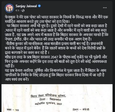 कश्मीर जैसे संवेदनशील मुद्दे पर ऐसा सवाल पूछा गया कि चारों तरफ बवाल मच गया है। कश्मीर को अलग देश बताया गया है। मामला बिहार का है। बिहार के किशनगंज में 7वीं कक्षा की अर्द्धवार्षिक परीक्षा चल रही थी। ये परीक्षा बिहार शिक्षा परियोजना परिषद् द्वारा आयोजित की जाती है. पेपर अंग्रेजी का था. इसमें जो सवाल पूछा गया वो कुछ इस तरह था जो कश्मीर को एक अलग देश की तरह दर्शा रहा था। कुछ ही समय में इस प्रश्नपत्र की फोटो सोशल मीडिया पर आ गई और मुद्दा बना कि- क्या बिहार सरकार कश्मीर को भारत का अंग नहीं मानती?