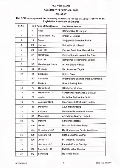 गुजरात चुनाव के लिए कांग्रेस की दूसरी लिस्ट जारी, 46 उम्मीदवारों के नाम घोषित
