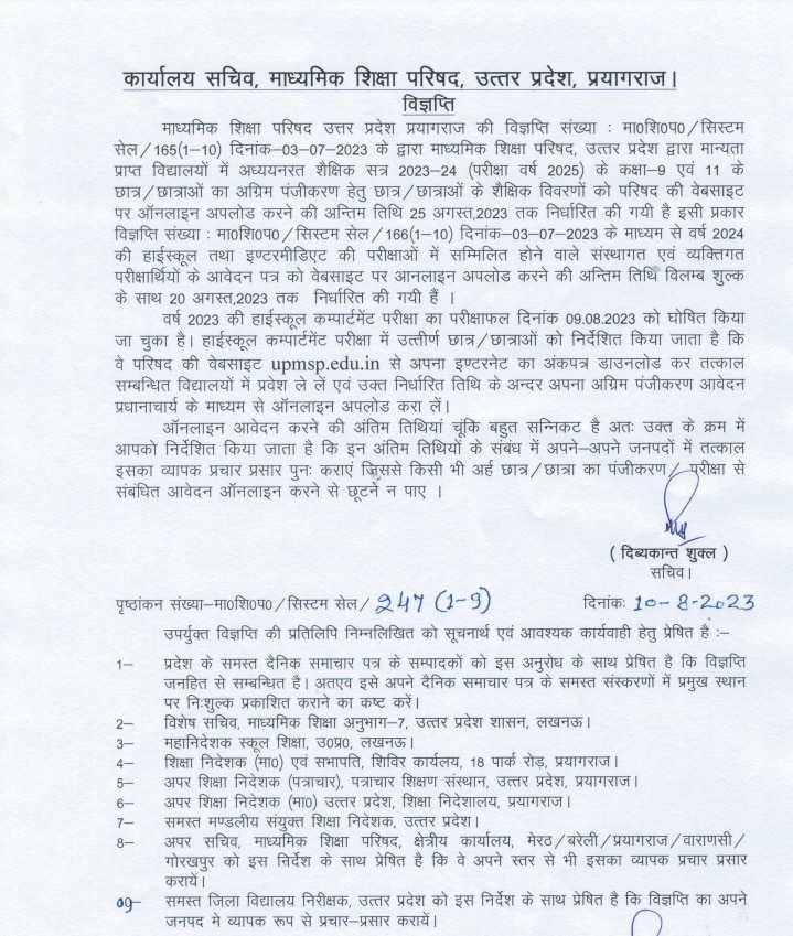 वहीं शैक्षिक सत्र 2023-24 और परीक्षा वर्ष 2025 के कक्षा 9 और 11 के छात्र-छात्राओं का अग्रिम पंजीकरण 25 अगस्त तक हो सकेगा। यूपी बोर्ड की वेबसाइट पर ऑनलाइन पंजीकरण शैक्षणिक विवरणों के साथ कर सकते हैं।