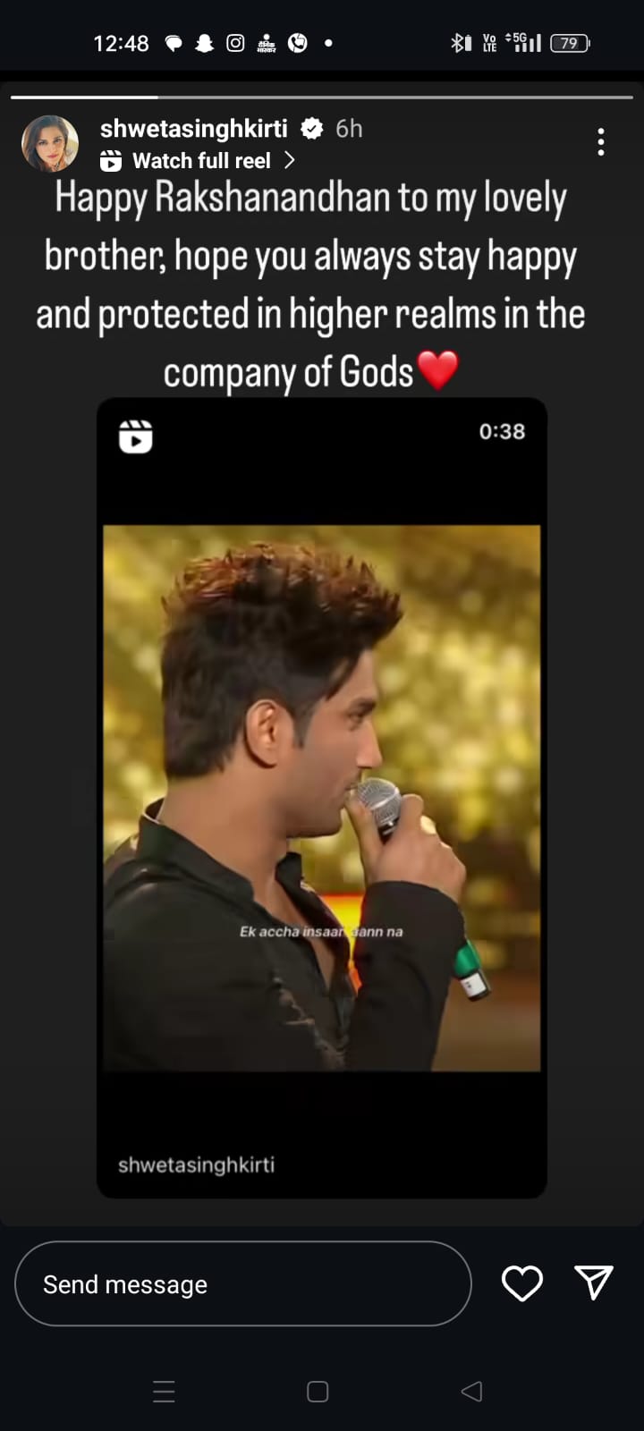 श्वेता ने अपने इंस्टाग्राम पर अपने भाई सुशांत सिंह राजपूत की एक पुरानी पोस्ट शेयर की। इसमें उन्होंने लिखा कि हैप्पी रक्षाबंधन मेरे प्यारे भाई, आप न केवल एक महान कलाकार थे, बल्कि एक महान इंसान भी थे। देखो आपने कितने दिलों को कितने प्यार से भर दिया है। मैं भी कुछ ऐसा ही करना चाहता हूं और दुनिया में प्यार और खुशी फैलाने के आपके नक्शेकदम पर चलना चाहता हूं। वहीं स्टोरी पर शेयर करते हुए लिखा कि हैप्पी रक्षाबंधन मेरे प्यारे भाई। मुझे उम्मीद है कि तुम देवताओं के सानिध्य में हो और वहां हमेशा खुश और सुरक्षित रहोगे।