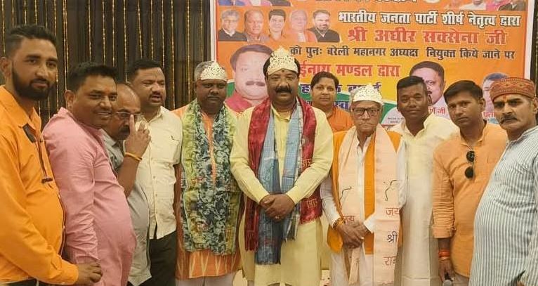 Bareilly: भाजपा नेताओं का चांदी का मुकुट पहनाकर किया स्वागत