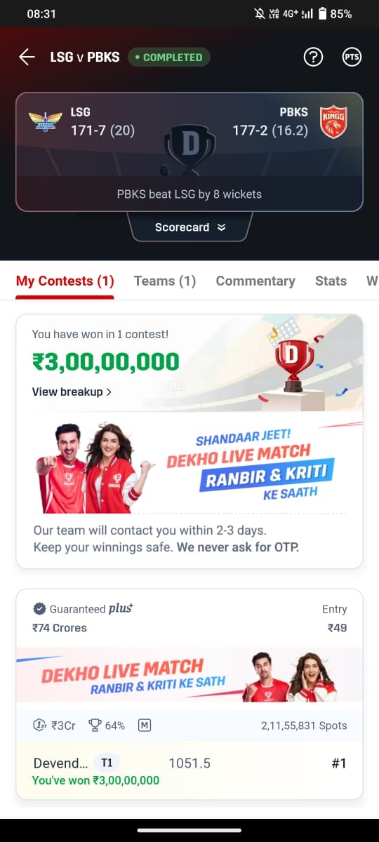 दयराम लखनऊ और पंजाब के बीच आईपीएल मैच में ड्रीम 11 पर 49 रुपए लगाया जिसमें उनके हाथ सफलता हाथ लगी और रातों-रात करोड़पति हो गए। पूरे पटेहरा कला मड़िहान तहसील के बाद पूरे जिले में चर्चा का विषय बना हुआ है। चारों तरफ खुशी का माहौल है दयाराम ने बताया कि अब जिंदगी अच्छे से कट जाएगी।