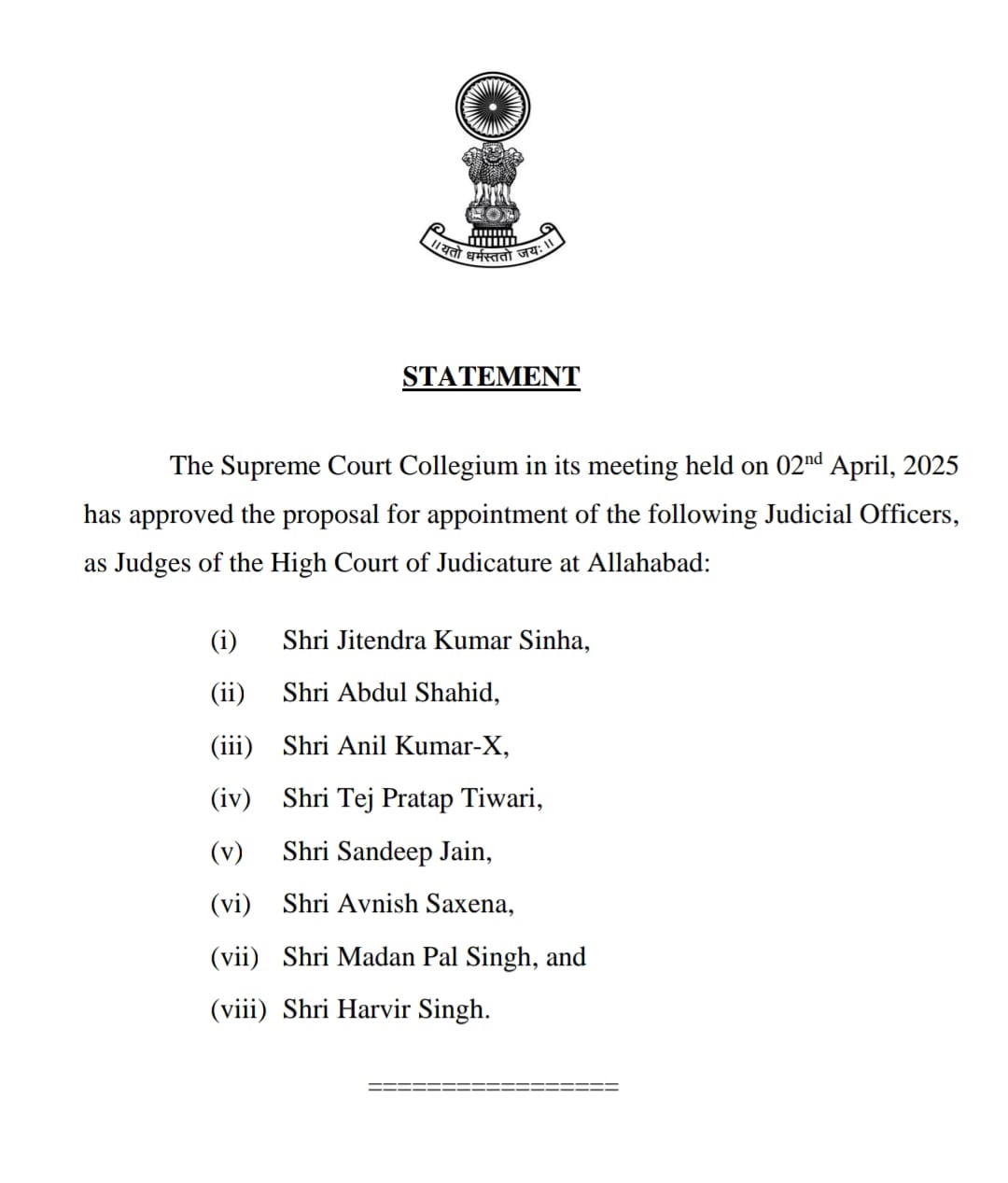 बयान में कहा गया, ‘‘उच्चतम न्यायालय कॉलेजियम ने दो अप्रैल, 2025 को आयोजित अपनी बैठक में निम्नलिखित न्यायिक अधिकारियों को इलाहाबाद उच्च न्यायालय के न्यायाधीश के रूप में नियुक्त करने के प्रस्ताव को मंजूरी दे दी है।’’ बयान के मुताबिक, जिन अधिकारियों को पदोन्नत करने की मंजूरी दी गई है उनमें जितेन्द्र कुमार सिन्हा, अब्दुल शाहिद, अनिल कुमार, तेज प्रताप तिवारी, संदीप जैन, अवनीश सक्सेना, मदन पाल सिंह और हरवीर सिंह शामिल हैं।
