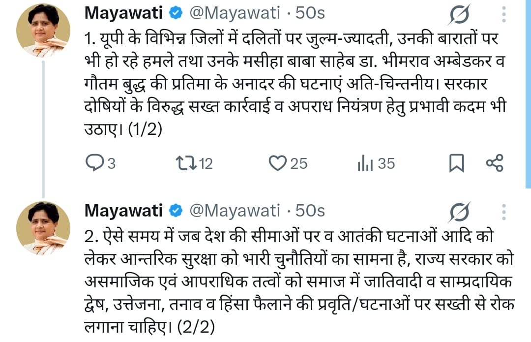 उन्होंने ‘एक्स’ (पूर्व में ट्विटर) पर पोस्ट कर कहा, ‘उत्तर प्रदेश के विभिन्न जिलों में दलितों पर जुल्म-ज्यादती, उनकी बारातों पर भी हो रहे हमले तथा उनके मसीहा बाबा साहेब डा. भीमराव आंबेडकर व गौतम बुद्ध की प्रतिमा के अनादर की घटनाएं अति-चिन्तनीय है।”