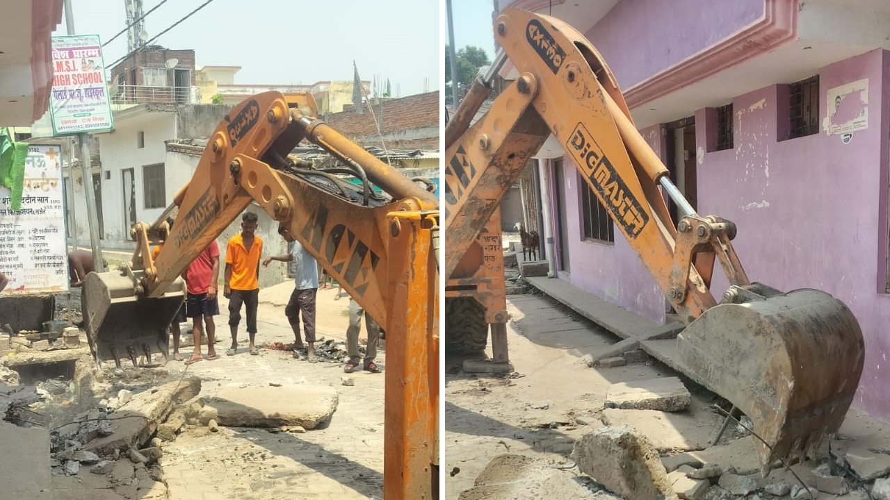 नगर पंचायत का एक्शन : सड़कों पर बने अवैध लिंटर-रैंप को बुलडोजर से हटाया