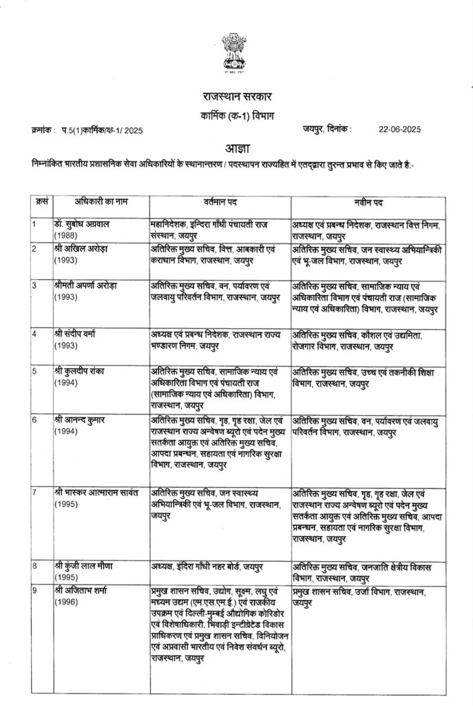 वरिष्ठ आईएएस अधिकारी अखिल अरोड़ा को करीब पांच साल बाद वित्त विभाग से हटाकर जन स्वास्थ्य अभियांत्रिकी विभाग (पीएचईडी) में अतिरिक्त मुख्य सचिव पद पर नियुक्त किया गया है। अपर्णा अरोड़ा को वन विभाग से सामाजिक न्याय एवं अधिकारिता विभाग में अतिरिक्त मुख्य सचिव नियुक्त किया गया है।