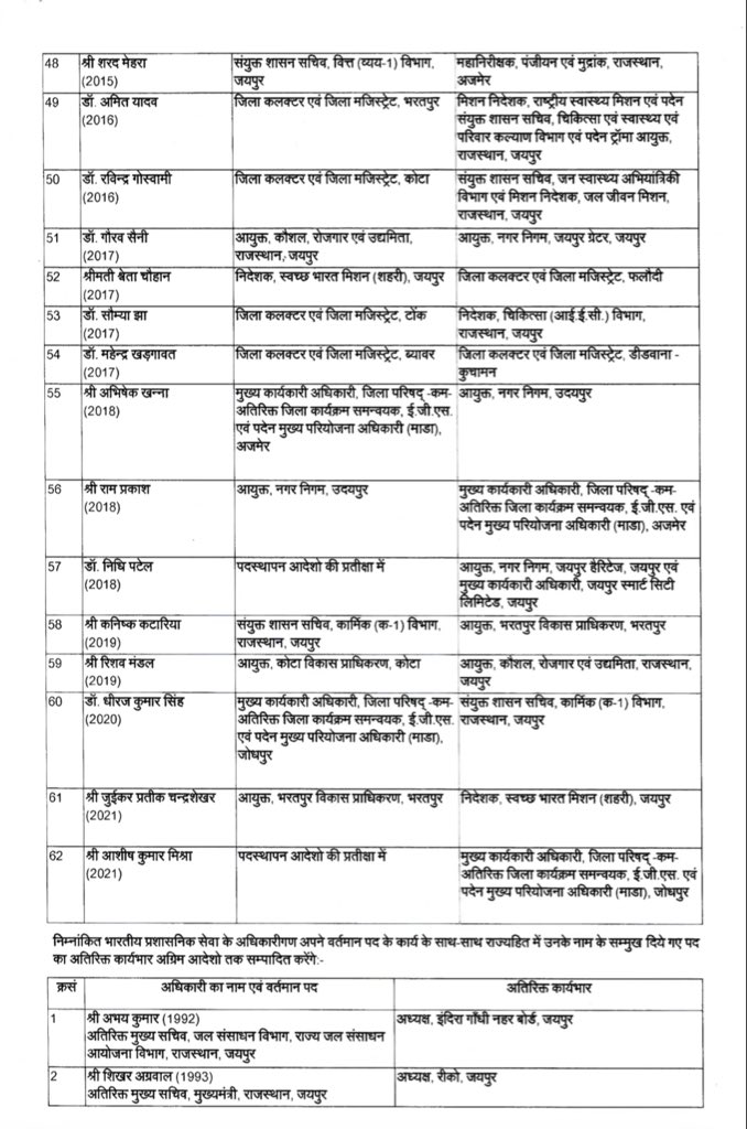 जयपुर। राजस्थान सरकार ने नौकरशाही में बड़ा फेरबदल करते हुए भारतीय प्रशासनिक सेवा (आईएएस) के 62 अधिकारियों के तबादले किए हैं। कार्मिक विभाग ने रविवार देर रात तबादला सूची जारी की। इसके तहत आठ अतिरिक्त मुख्य सचिवों और 11 जिलाधिकारियों का भी तबादला किया गया है। साथ ही 21 आईएएस अधिकारियों को विभागों का अतिरिक्त प्रभार दिया गया है।