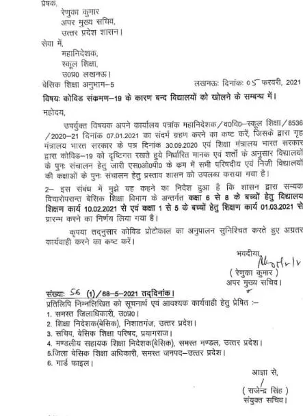 जहां एक तरफ कक्षा एक से लेकर पांचवीं तक के प्राइमरी स्कूल एक मार्च से खोल दिए जाएंगे। वहीं दूसरी तरफ कक्षा छह से लेकर आठ तक के जूनियर स्कूल 10 फरवरी से ही खोलने के आदेश सरकार द्वारा जारी कर दिए गए हैं। बच्चों के स्कूल खोलने को लेकर अपर मुख्य सचिव, बेसिक शिक्षा, रेणुका कुमार ने आदेश जारी कर दिया है।