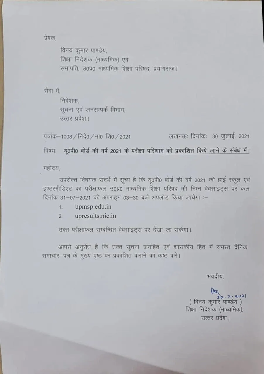 लखनऊ, अमृत विचार। उत्तर प्रदेश माध्यमिक शिक्षा परिषद की हाईस्कूल और इंटरमीडिएट बोर्ड परीक्षा-2021 का परिणाम शनिवार (31-07-2021) को घोषित किया जाएगा। उत्तर प्रदेश माध्यमिक शिक्षा परिषद, प्रयागराज के अध्यक्ष व शिक्षा निदेशक विनय कुमार पाण्डेय की ओर से शुक्रवार को देर शाम इस संबंध में सूचना जारी की गई।
