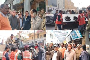 बुध बाजार क्षेत्र में सड़क की पटरियों पर से अतिक्रमण हटवाने पहुंचे अपर नगर आयुक्त प्रथम अतुल कुमार, अपर नगर आयुक्त द्वितीय अजीत कुमार व प्रवर्तन दल के प्रभारी एसके शाही व उनकी टीम।