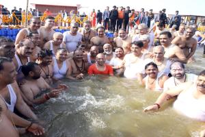 प्रयागराज। मुख्यमंत्री योगी आदित्यनाथ ने बुधवार को महाकुंभ के अवसर पर पतित पाविनी गंगा, श्यामल यमुना और अदृश्य सरस्वती के संगम में अपने मंत्रिमंडल के साथियों के संग पवित्र डुबकी लगायी और प्रदेश के लोगों की सुख समृद्धि की इस...