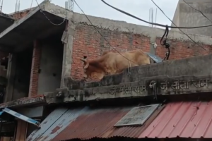 दुकान की छत पर चढ़ा छुट्टा सांड, वीडियो देख नहीं रोक पाएंगे हंसी